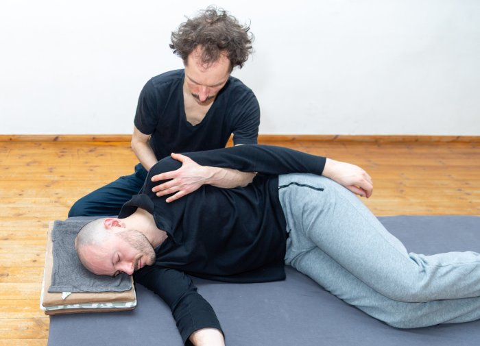 In a Functional Integration lesson, the Feldenkrais teacher’s touch reflects to the student how they currently organize their body and actions. They suggest, through gentle touch and movement, expanded possibilities for new movement patterns which are more comfortable, efficient, and useful. Functional Integration lessons are flexible in their approach, determined by the student’s needs. The student may lie comfortably on a table designed specifically for the work, or do some of the lesson sitting or standing. As needed, the teacher may also use various props to support the student’s comfort, to make certain movements easier, or to clarify a movement.